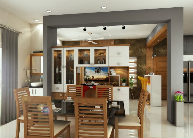 People frequently have a preference to buy dining room furniture and other items separately from the store that sells ready-made furniture. However, Interio interiors kottayam gives you the choice to purchase dining room furniture, including a table, chairs, and crockery shelves, in complementary styles and colours. The interior design of the dining area may be perfectly paired with a modular kitchen by using bespoke design and fabrication. You may choose a comfy design from Interio that meets your needs. Within the confines of the available area, a suitable bar counter may be created, or the wash counter can be improved by the addition of storage with complementary colour schemes. Explore some of our dining room assets on this page to add customization and value to your home decor package.